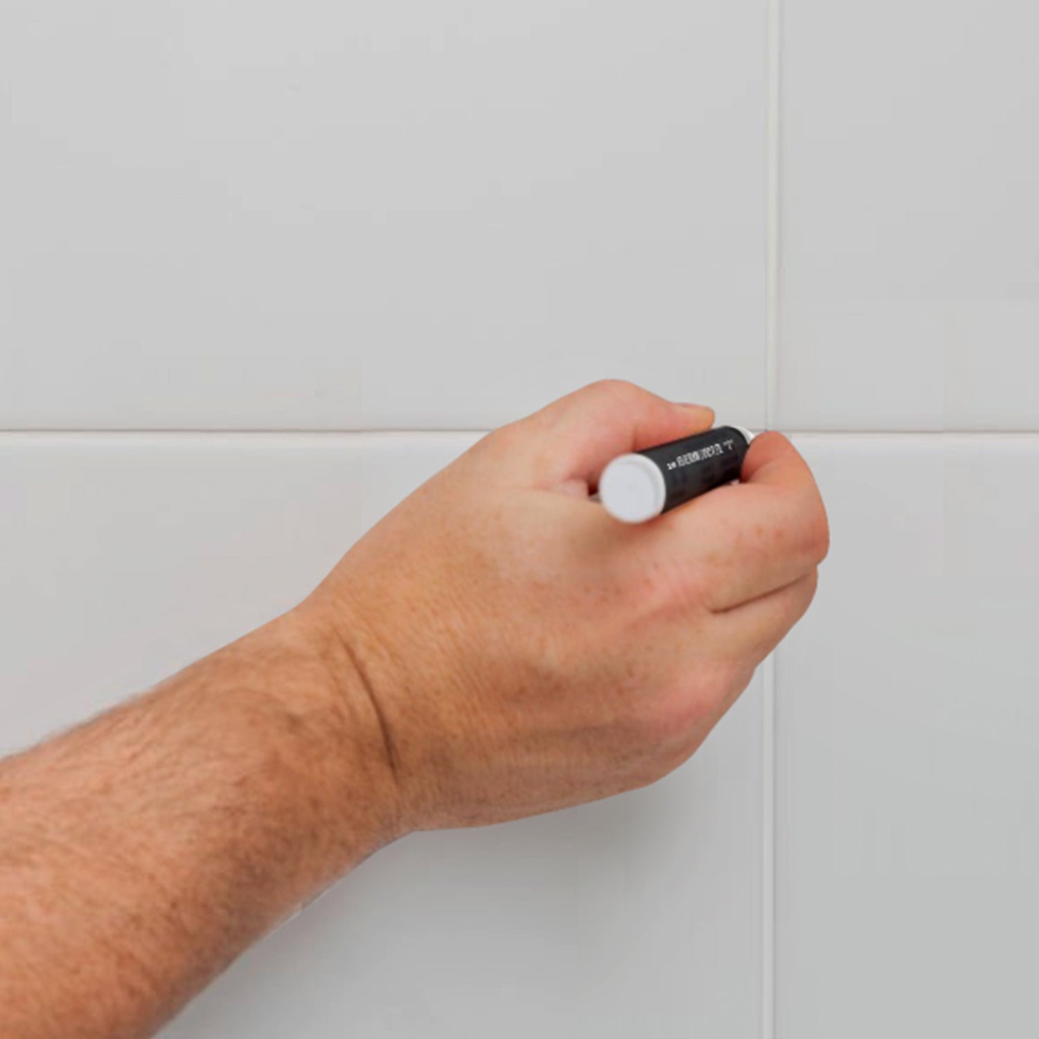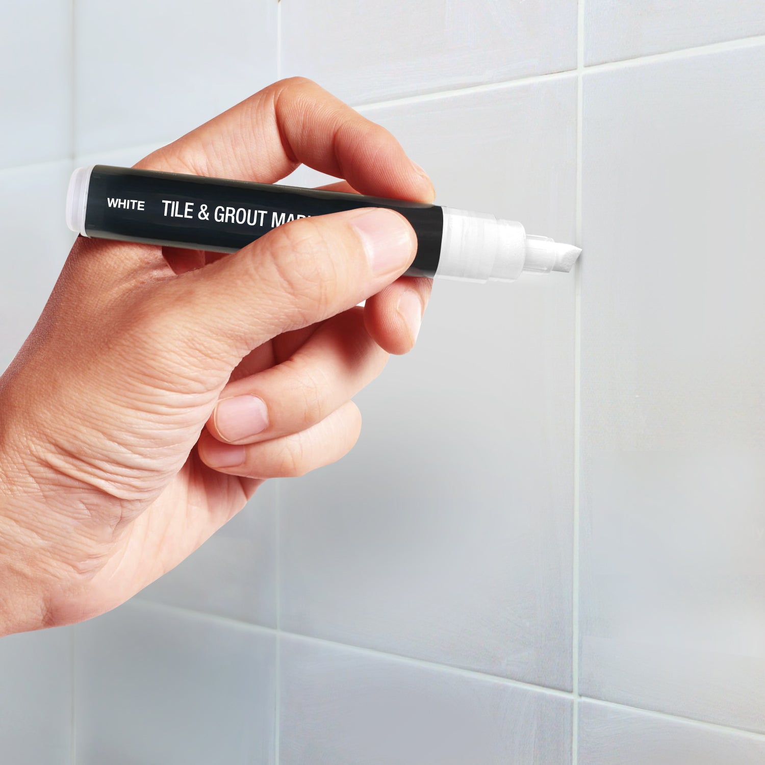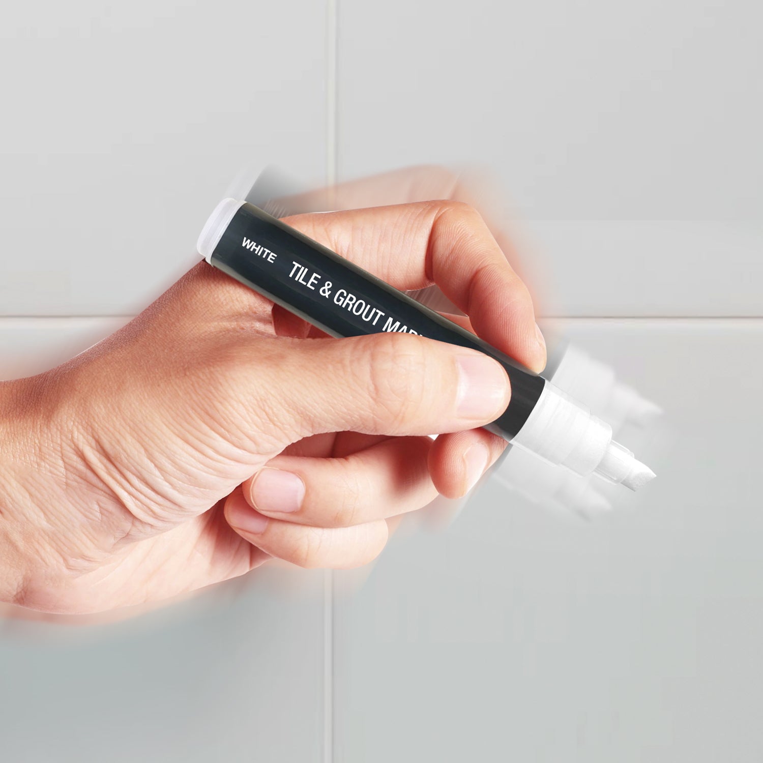 Carefully apply the marker along the grout lines, working in small sections. Wipe away any excess ink from the tiles with a damp cloth. Allow to dry completely before exposing to water.